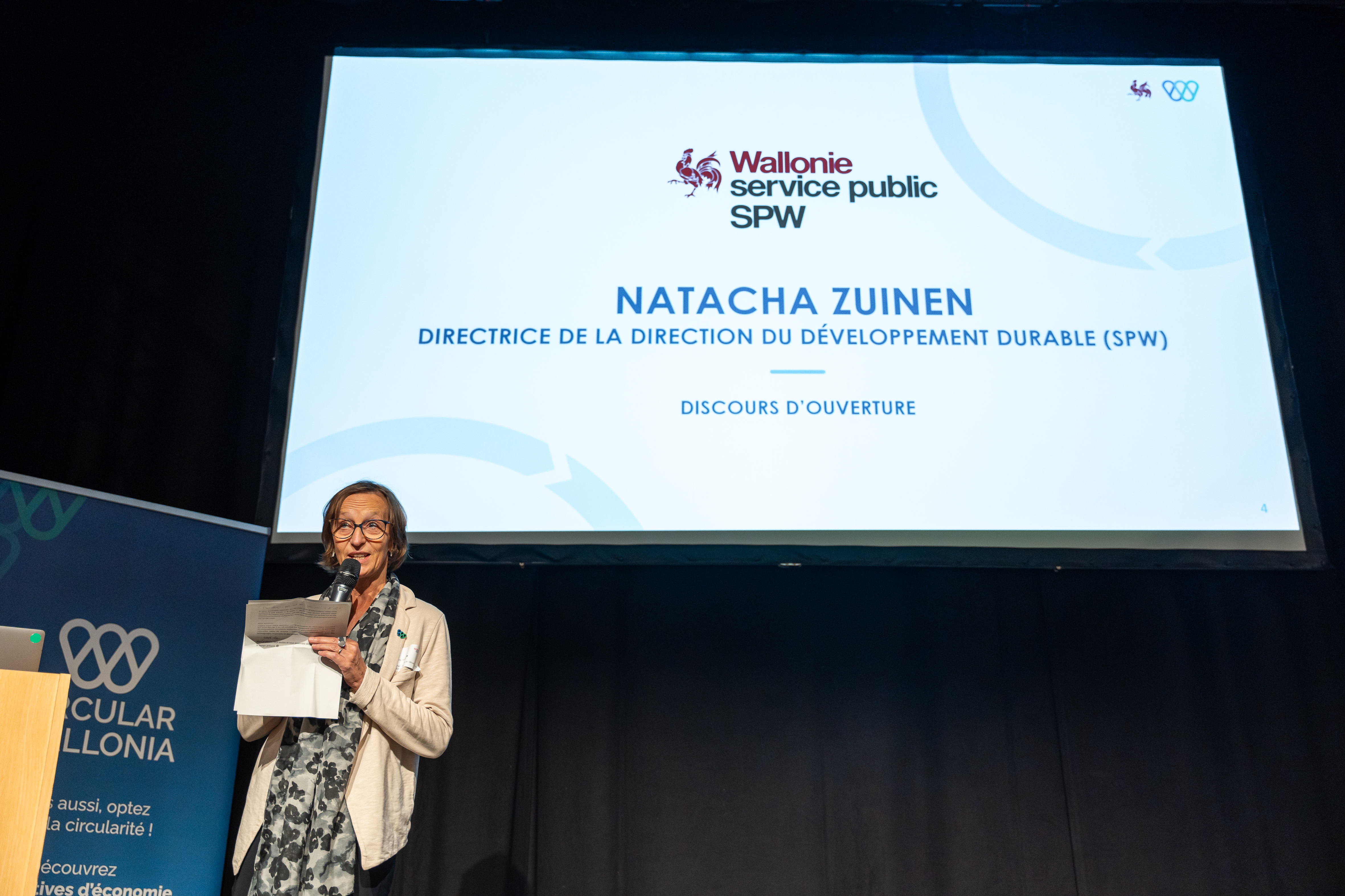 Natacha Zuinen, directrice de la Direction du développement durable du Service public de Wallonie, a ouvert la première partie de l’événement en soulignant le potentiel des achats publics pour l’économie circulaire et la valeur ajoutée de cette approche. Elle a insisté sur le fait que les pratiques d’achat circulaire peuvent réduire notre empreinte écologique, encourager l’innovation et soutenir l’économie locale.